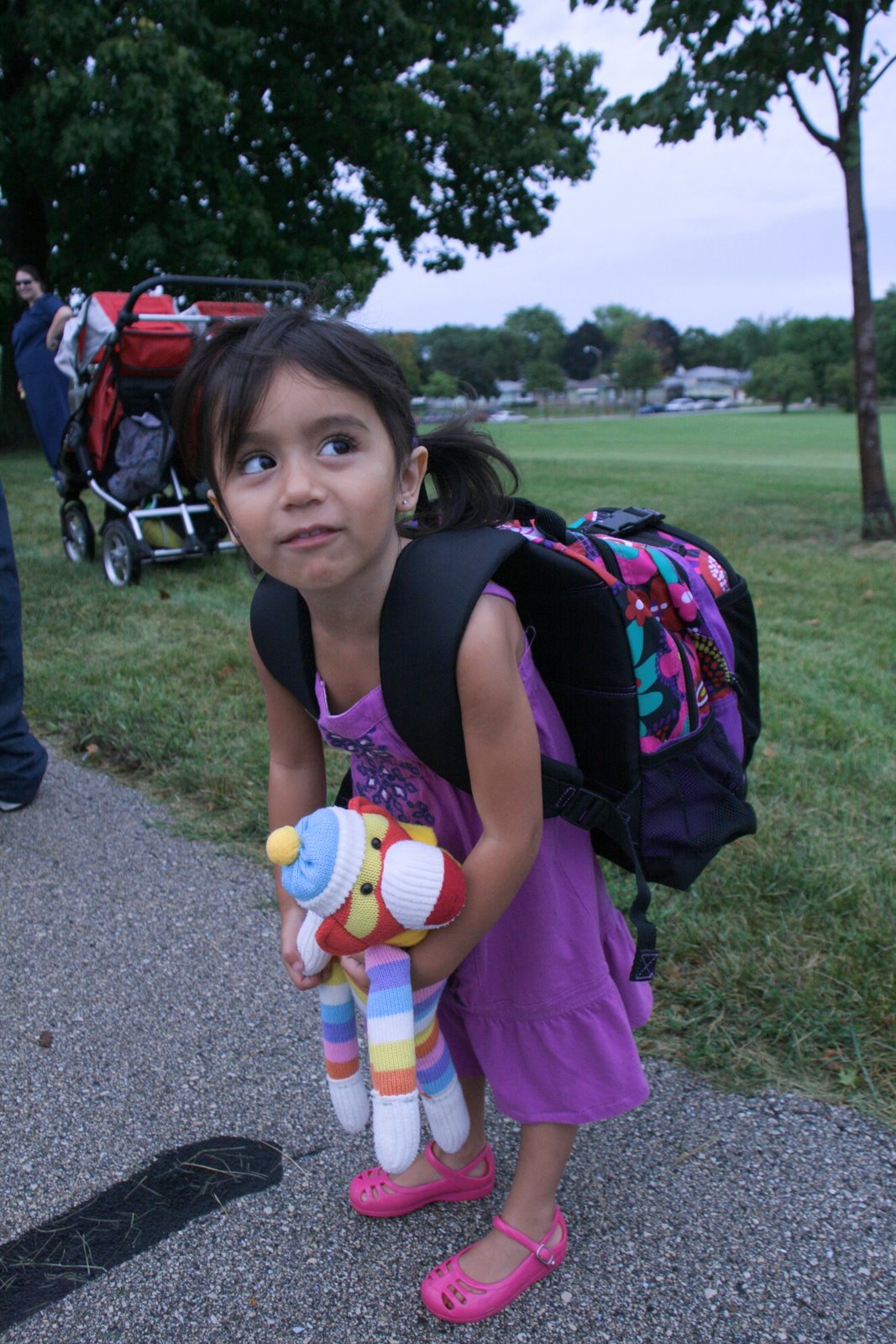 Sweet and silly Rebekah on her first day. I think she's exaggerating a little bit about how "heavy" this back pack is. There's not a whole lot in there!
